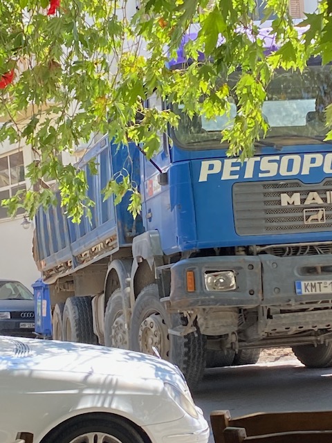 Heute sitze ich, einen Imbiss nehmend, vor dem Lokal Thiassos (Theatertruppe) unter den schönen Platanen und beobachte, was so auf der Straße vor sich geht.