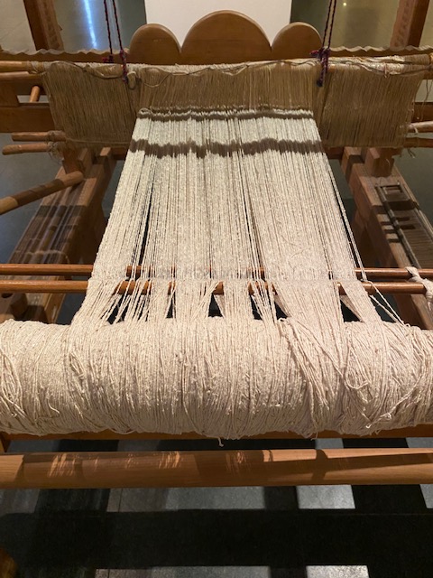 Dies ist ein Webstuhl aus dem 18. Jahrhundert, an dem große Teppiche gewebt werden konnten. Mir haben es die rauen Spannfäden angetan. Wie dann die Muster gewebt wurden, ahne ich bloß. Die Weberinnen mussten wohl bei jedem Durchschuss die Spannfäden entsprechend dem Muster auszählen und separieren.