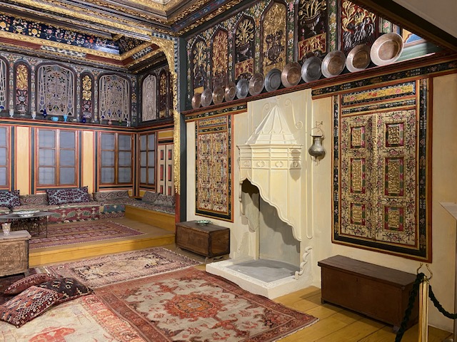 Die unter ihren fleißigen Händen entstehenden Teppiche schmückten dann die Herrenhäuser, so wie diesen mit reichen Holzschnitzereien getäfelten Empfangsraum in Ioannina im Epirus, 17. Jahrhundert.