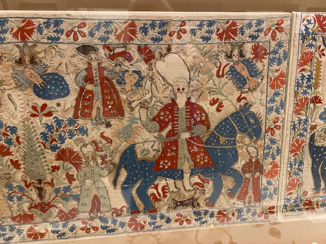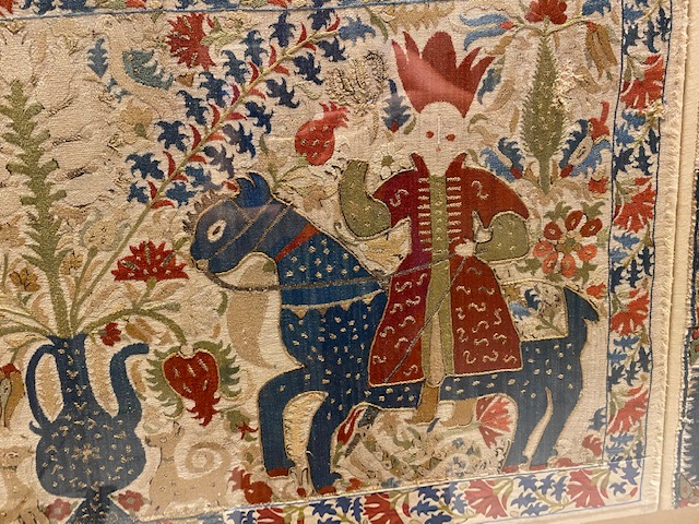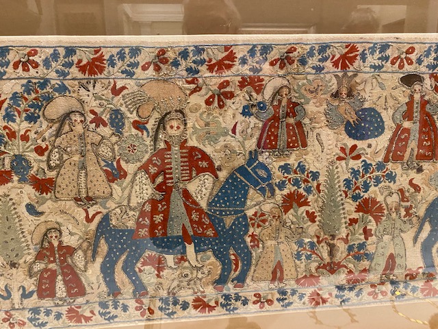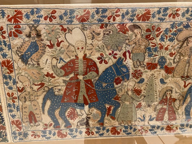 Oder dieses lange friesartige Tuch – eine Mischtechnik von Applikation und Stickerei – mit immer wiederkehrenden, sorgfältig variierten Gestalten? (die Bilder gehören eigentlich nicht unter-, sondern nebeneinander)