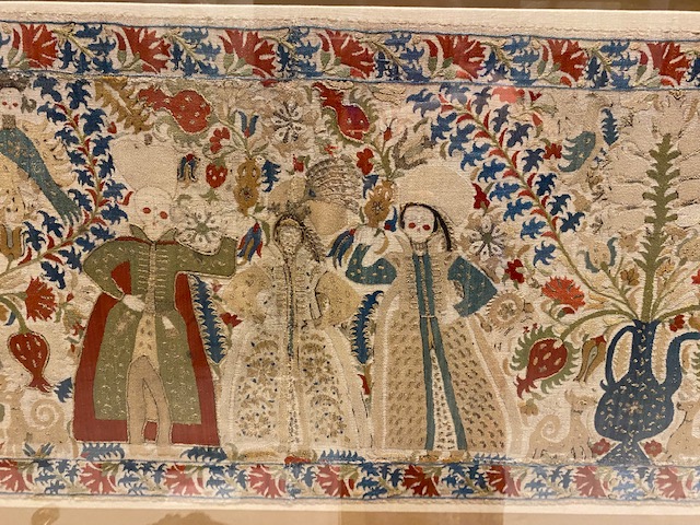 Nun aber mache ich einen Sprung hinüber zur Stickerei, die mich heute echt bezaubert hat. Sie ist so köstlich! Zum Beispiel dieses große Tischtuch, in dessen leerer Binnenfläche sich Kleiderpuppen der gegenüberliegenden Vitrine spiegeln.