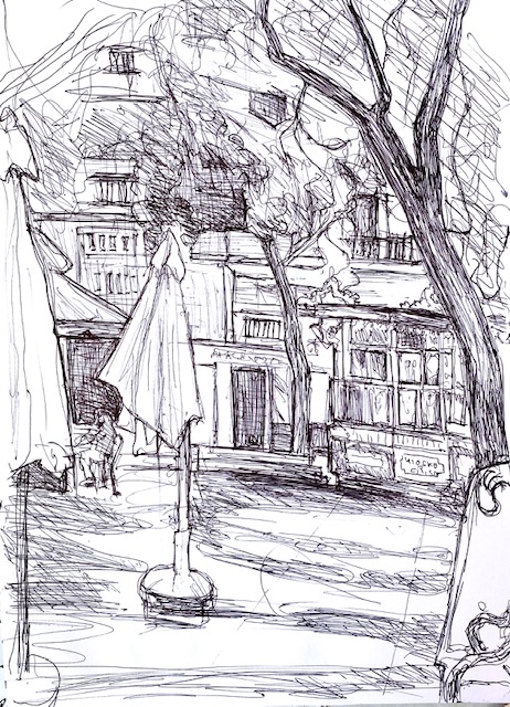 Hübscher war das Cafe, in dem wir unser Frühstück nahmen. Es lag an der Ecke eines reizenden Parks mit riesigen Bäumen und blühenden Büschen, in denen grüne Papageien herumkrakeelten. Die Zeichnung machte ich, bevor die Kellnerin die Tische und Stühle auf dem Platz ausbreitete. Der Kiosk mit den vielen kleinen Fenstern (rechts im Bild) war noch geschlossen, und die roten Sonnenschirme waren noch zusammengefaltet.