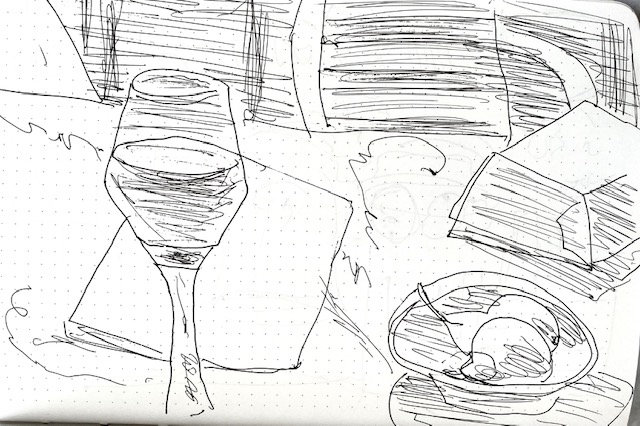 Das waren dann auch schon die Zeichnungen, die ich auf der Reise zustande brachte. Am Abend des 4.10, nun wieder zu Hause, nahm ich erneut den Stift und zeichnete ganz entspannt den Balkontisch mit allem Drum und Dran.