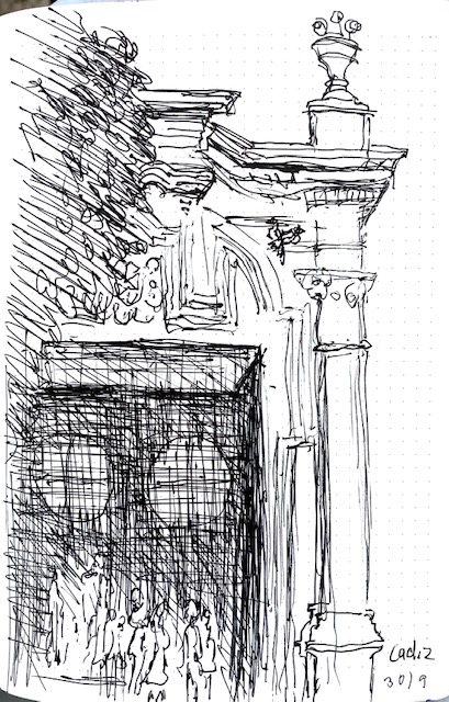 In Cadiz machte ich ein paar weitere Versuche, architektonische Einzelheiten festzuhalten. Auf der zweiten Zeichnung wird die weiße Kirchenfassade von einem schweren Schatten halbiert.