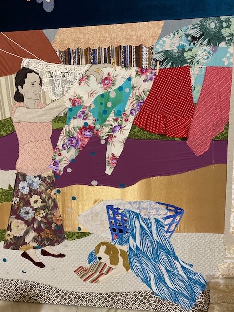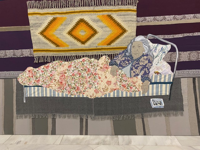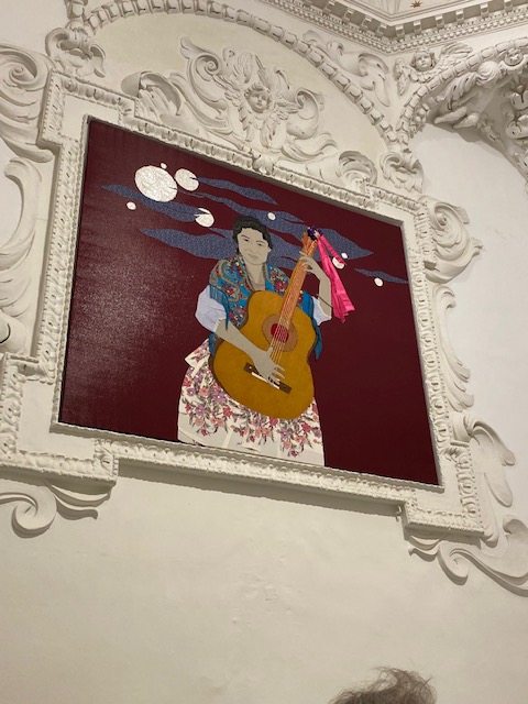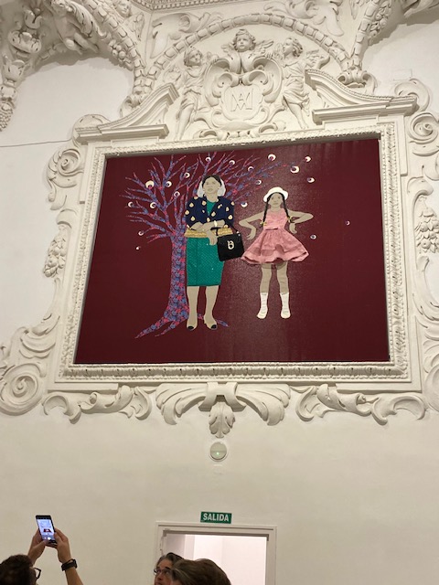 In diese Räumen in Sevilla  passt ihre Ausstellung , „Remembranza y Resignificacion“ wie eine Hand in den Handschuh:  Erinnerung und Neubestimmung sind ja die Motive, die diesen ganzen Baukomplex – und nicht nur diesen – kennzeichnen und geradezu als Leitmotiv für Andalusien gelten könnten (gestern erzählte ich z.B. von der Tabakfabrik, die zur Universität wurde).  Die Bilderwelt von Mirga-Tas selbst greift tief in die Vergangenheit zurück und sucht mithilfe einer lange in Vergessenheit geratenen Kunstform – Textilcollage – Erinnerungsbilder in die Gegenwart zu holen und neu zu interpretieren.