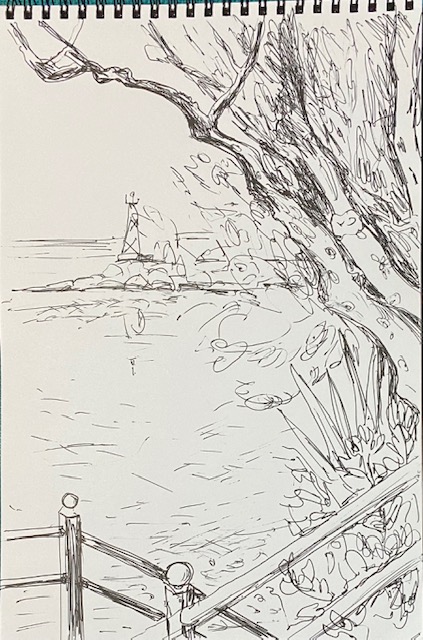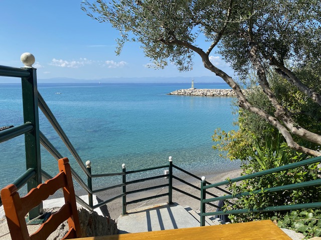 Wieder mal saß ich auf dem besonnten Tavernenstuhl über dem Meer, um mein Haar zu trocknen, und holte meinen Block hervor, um das Gesehene zu skizzieren. Auf dem Foto sieht alles fest und gestimmt aus, aber mir schien es leicht, fast durchlässig in der feinen Herbstsonne zu schweben. Kaum wagte ich einen festeren Strich, um die festliche Stimmung der Natur nicht zu stören.