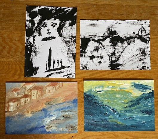 Vorsichtig ziehe ich ein Dossier heraus, in dem Zeichnungen und bemalte Pappen stecken. Von den vielen habe ich vier abfotografiert. Jetzt weißt du vielleicht schon, von wem das Päckchen so liebevoll gepackt wurde?