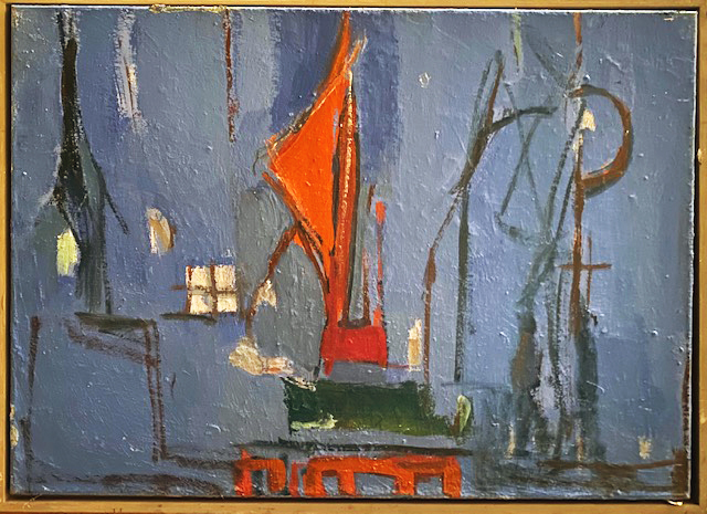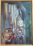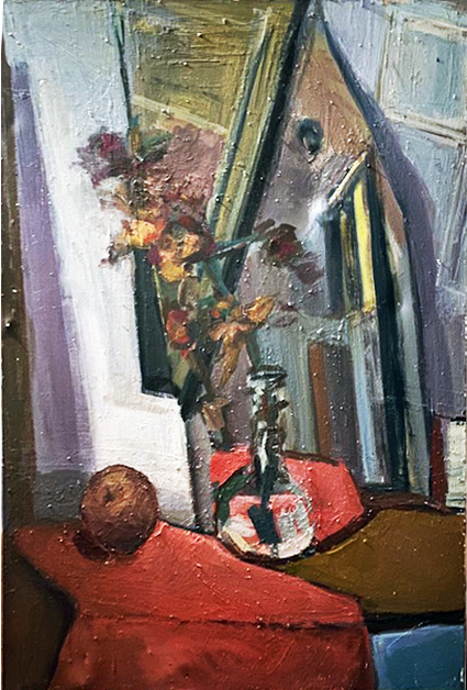 Bleibt noch ein Stillleben einzuordnen. In einem zerbrochenen Spiegel zeigt sich der Raum, in dem ich den herbstlich vertrockneten Zweig in der Vase und einen bräunlichen Apfel malte – lang lang ist’s her.