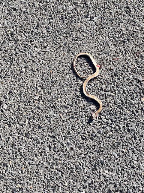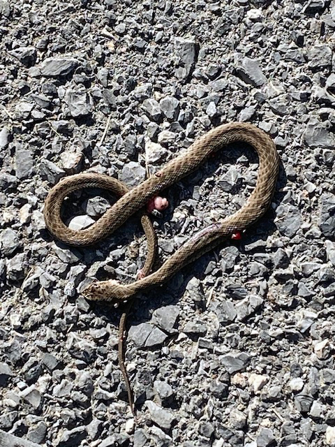 Ich vermute, eine Schlange hatte mein Atelier geeignet gefunden, hier ihre Brut zur Welt zu bringen. Doch dann geschah etwas. Entweder die Mama Schlange wurde überfahren, wie diese, die ich vorgestern auf der Straße fand. Mein Mann ließ nicht zu, dass ich sie berührte, nur fotografieren durfte ich sie aus der Entfernung (warum haben die meisten Menschen nur so viel Angst vor Schlangen?), dann schob er sie mit dem Stock an den Straßenrand, wo nun ihre Oberseite zu sehen ist. Vielleicht eine Sandviper, die hier in Griechenland überall vorkommt und giftig ist. Aber was heißt giftig? Eine tote Schlange beißt nicht mehr.