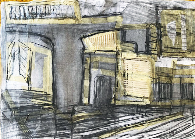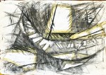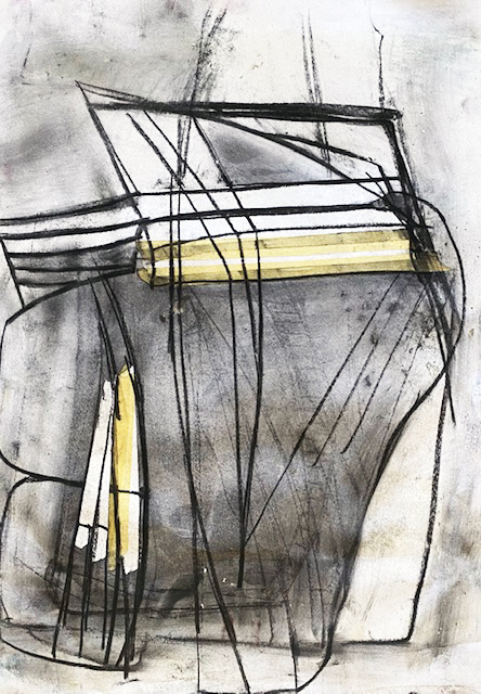 Ich freute mich besonders übers Wiedersehen mit den Kohlezeichnungen, in die ich gelbe Klebestreifen hineingearbeitet habe.