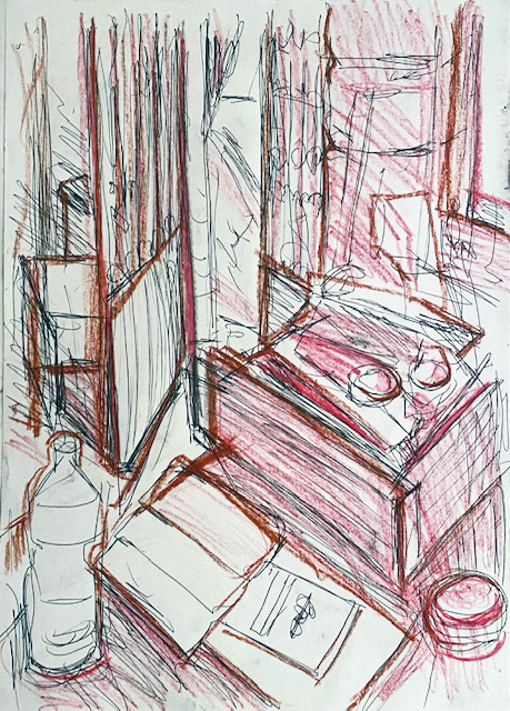 Unordnung im Atelier: zweimal mit geöffneter Tür – wobei das zweite mit Kuli und Ölkreide entstand und hier bei den Kohlezeichnungen nicht mitgezählt wird.