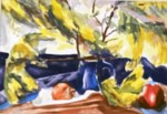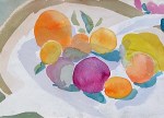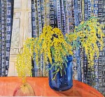 Aha, ja, in der Vase stehen Mimosen, wir hatten damals einen Mimosenbaum im Garten. Mein Hauptinteresse galt dem Vorhang. Den Stoff hatte ich in einer Textilfabrik bei Frankfurt gekauft, die ihren Betrieb einstellte. Wir hatten wenig Geld, und so suchte ich preiswerte Stoffe für unsere Gardinen. Diese waren sehr schwer, samtig, und das Muster gefiel mir sehr. Ich brauchte es für Vorhänge in unserer Athener Wohnung. ich gab mir große Mühe, die Farben genau wiederzugeben, auch den x Unterschied zwischen den beleuchteten und den schattigen Teilen. Die Mimosen und das Tischtuch gaben mir die beiden anderen Hauptfarben: gelb und rot, die Vase verstärkte das Blau. Anfangs war das Blatt größer, daher ist der Apfel angeschnitten. Ich fand das Rot zu viel und schnitt es ab. Jetzt ist das Bild fast quadratisch, ausgemessen habe ich es nicht, könnte ca 40 cm Seitenlänge sein. Gemalt habe ich es in den 80er Jahren in Athen. Danke für dein Interesse!