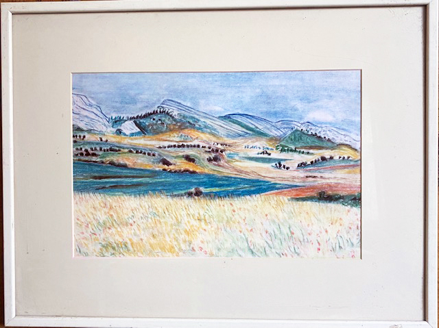 Die Ölkreide ist leichter zu handhaben und gröber. Man gibt sie wegen ihrer starken Farben und ihrer Festigkeit gern den Kindern in die Hand. Aber natürlich kann man auch mit diesen Farben feine Abschattierungen erreichen,wie bei dieser Ansicht der Berge hinter dem Kloster Ag. Marina.