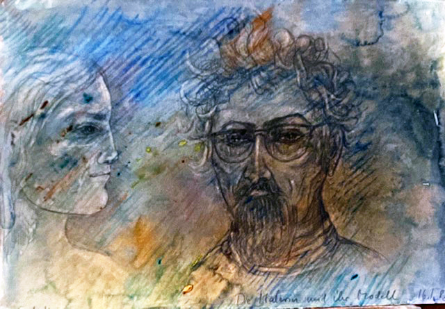 Dieses ironisch auf Picassos Titelgebung „Der Maler und sein Modell“ bezogene Bild „Die Malerin und ihr Modell“ ist mit Ölkreide plus Wasserfarben gezeichnet und mittelgroß.