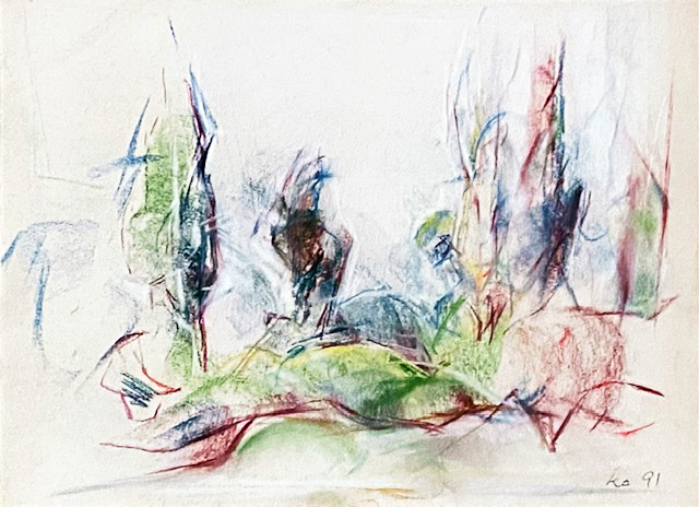 Die Pastellkreide benutzte ich selten, denn sie ist sehr empfindlich, und ich bin sehr ungeduldig. Eine Zeitlang versuchte ich mich damit, Schicht um Schicht aufzutragen und einzeln zu fixieren. Beim Aufräumen fand ich bisher nur diese eine Pastellkreidenzeichnung, die ich wegen ihrer zarten Struktur hinter Glas brachte.