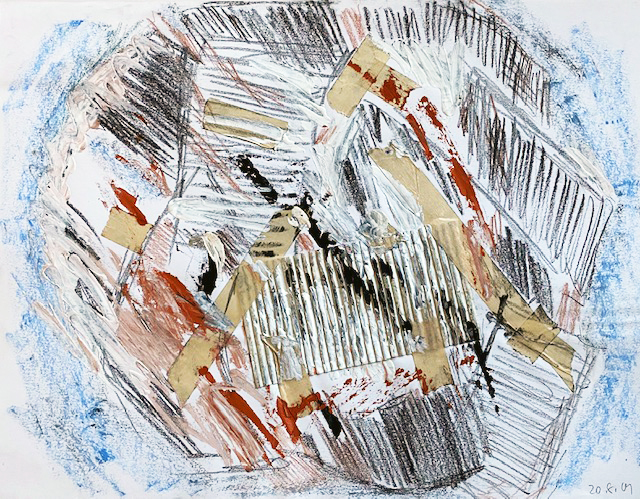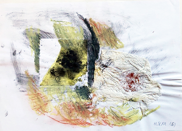 Dann kommt die Nacht vom 10. auf den 11-9-2001. Die ganze Nacht zeichne ich wie besessen, und immer entstehen „Dämonen“ unter meinen Händen. Ich will das nicht, überzeichne sie wieder und wieder, aber es hilft nichts (1, Ölkreide), und so lasse ich meinen Händen freien Lauf. Es entstehen: eine gestückelte Schlange (2, mit Klebestreifen), „Flugdämonen“ und schließlich „Landebahnen“, auf denen zwei Feuer glimmen. Etwas geschieht in dieser Nacht, das ich nicht einordnen kann. Ich notiere meine Eindrücke im Tagebuch und gehe schließlich um sechs Uhr morgens schlafen. Später weckt mich mein Mann, um mir zu sagen, dass Flugzeuge die „Zwillingstürme“ angegriffen und zerstört haben (11/9).