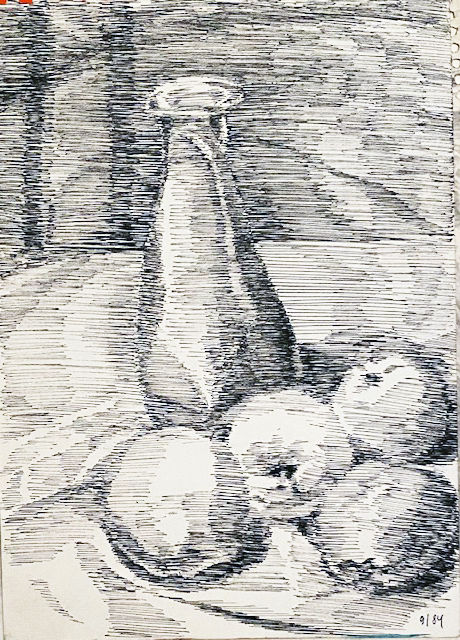 Eine kleine Federzeichnung, die ich noch nicht zeigte, habe ich an eine Seitenwand gehängt. Dabei handelt es sich um ein Experiment: kann ich Gegenstände einzig durch waggrechte Linien und unter Vermeidung von Umrisslinien sichtbar machen? Ja, ich kann΄s.