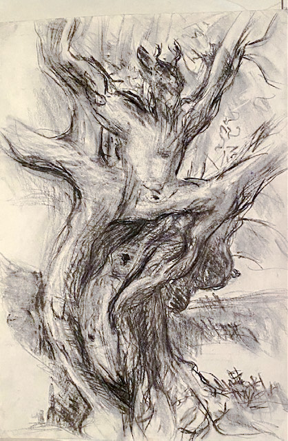 Das größere Bild, das auf dem Tisch rechts steht, habe ich noch nicht vorgestellt und will es jetzt nachholen: Es ist eine Federzeichnung von einem ganz besonderen Olivenbaum.