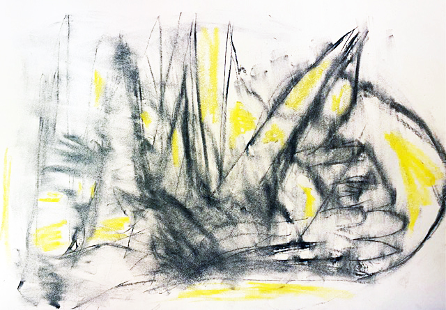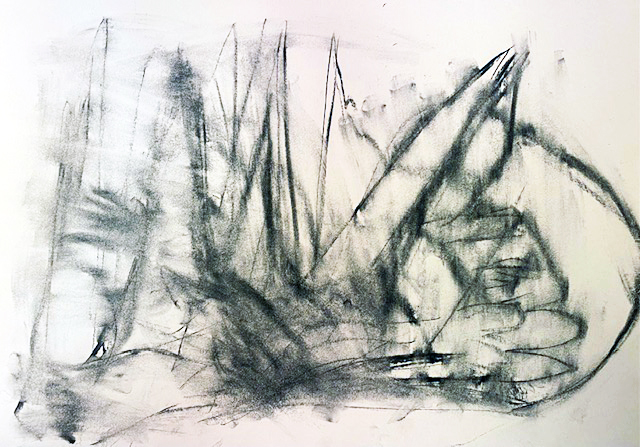 Ich wollte mal wieder ein bisschen zeichnen, nahm einen Zeichenkarton und Kohle und legte los. Heraus kam eine recht wilde Kohlekritzelei. Nun nahm ich einen Radierer und auch meine Hand, um die schwarzen Linien zu reduzieren und zu verwischen.