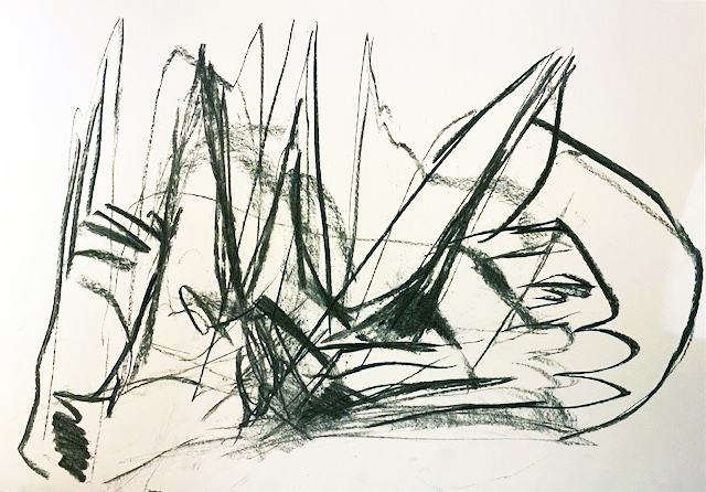 Ich wollte mal wieder ein bisschen zeichnen, nahm einen Zeichenkarton und Kohle und legte los. Heraus kam eine recht wilde Kohlekritzelei. Nun nahm ich einen Radierer und auch meine Hand, um die schwarzen Linien zu reduzieren und zu verwischen.