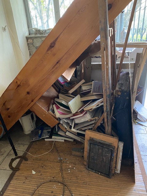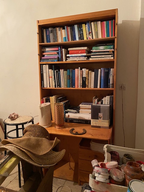 Ich erzählte gestern von meinem Malheur, als ein Bücherregal sein Gleichgewicht verlor und seinen Inhalt zwischen Regal und Staffelei entleerte. Später räumte ich die Bücher ordentlich zurück ein und sortierte Überflüssiges aus.