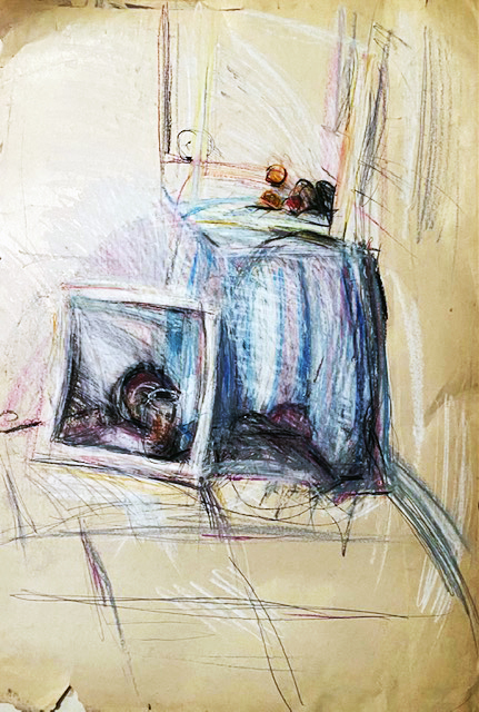Dann entrollte ich zwei Rollen mit Zeichnungen. Zum Vorschein kamen vier farbige Blätter und sehr viele Kohlezeichnungen, fast alle im Format 70×100 und auf billigem grauem Papier, das teilweise vergilbt und an den Rändern „abgenagt“ ist. Die Zeichnungen sind aber gut erhalten. Ich freute mich sehr, sie wiederzusehen.
