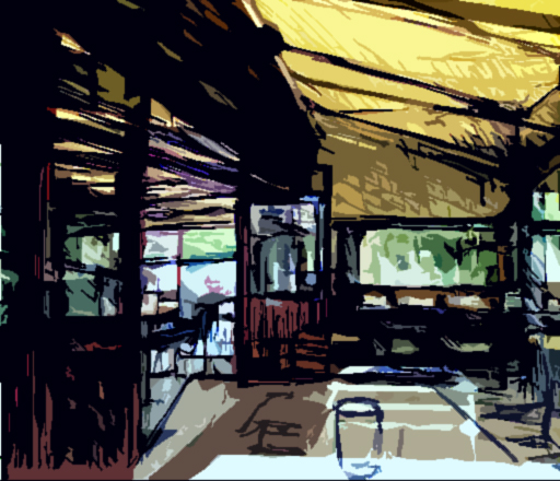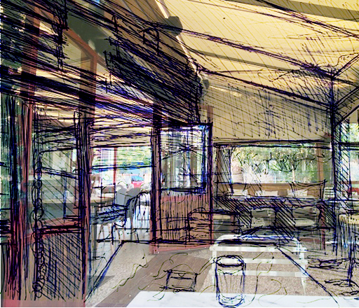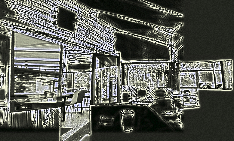 Später dann, nun in einem anderen Cafe, erneut eine Wartezeit nutzend, versuchte ich, die komplizierte Raumarchitektur festzuhalten.
