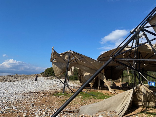 Bei Hobos Bar, deren Sonnenschirme und Sommerinstallationen wie jedes Jahr Wind und Wetter überlassen blieben, machte ich halt, um ein wenig zu zeichnen. Ich mag diese chaotische Welt von sinnlosen Formen und habe mich schon früher mal an ihnen abgemüht (Fotos hier. Fotos und Zeichnungen hier). Ich mag auch die Symbolik.