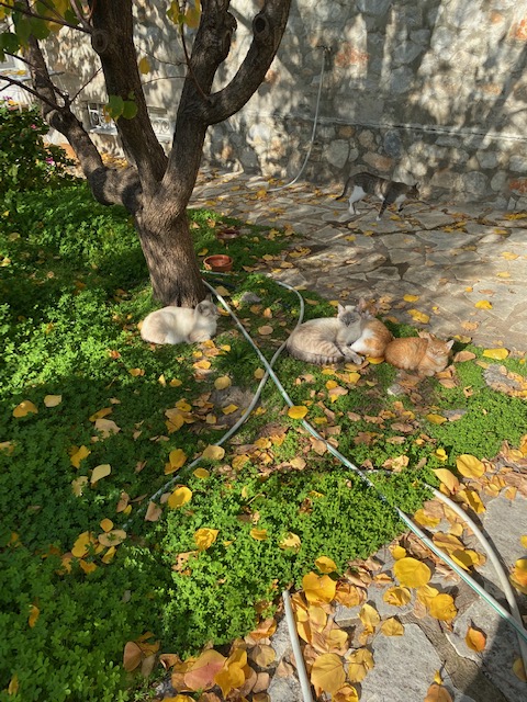 Der Anstieg durch den Olivenhain fiel mir heute leicht. Und als ich in unseren Garten trat, das goldrote Laub des Aprikosenbaums, die weißen Rosenblüten, den roten Hibiskus und die Katzenmeute begrüßend, dachte ich: