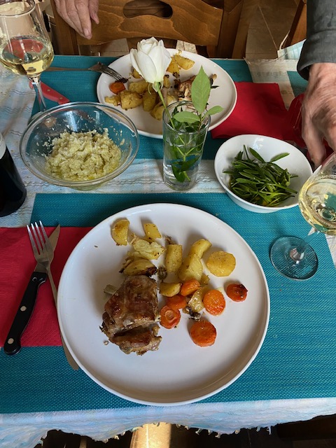 Mein Mann hatte inzwischen einen Braten im Backofen vorbereitet und den Tisch gedeckt (im weißen Schälchen der Salat, den ich an der Küste gesammelt hatte).