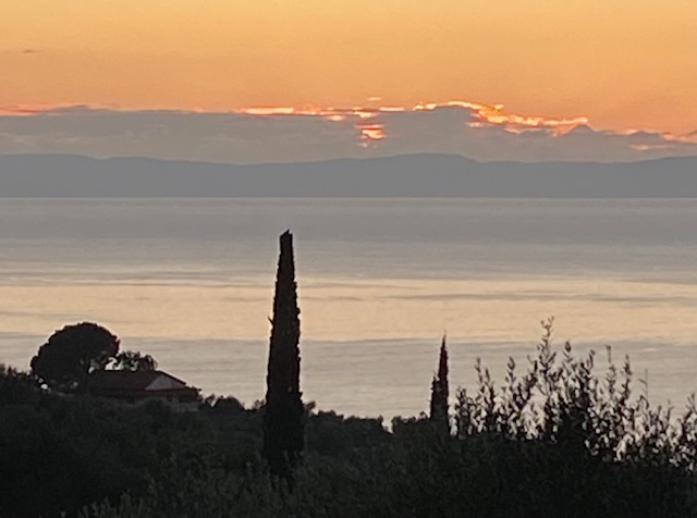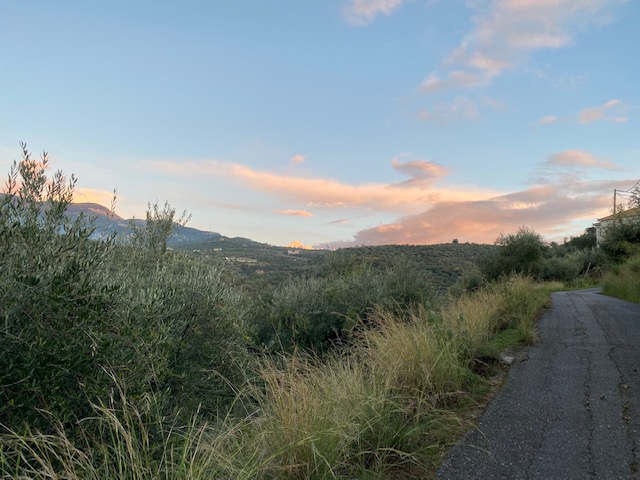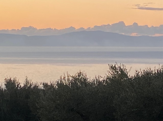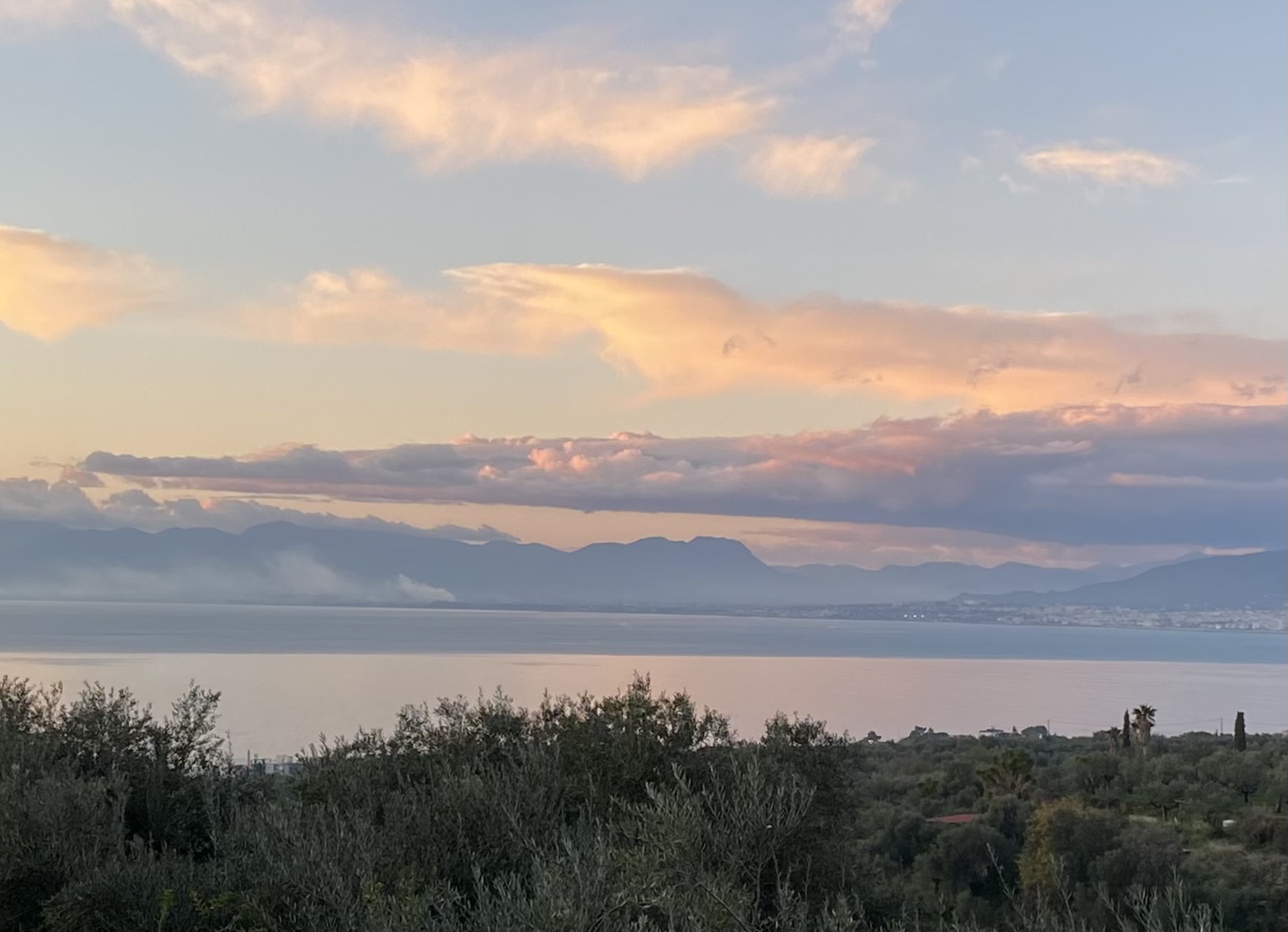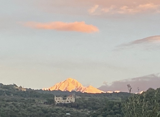 Die Gipfel des Taygetos sind wieder dick beschneit. Beim Spaziergang am späten Nachmittag sah ich es. Die letzten Sonnenstrahlen ließen das breite Bergmassiv und den höchsten Gipfel, nach seiner Form „Pyramide“ genannt, aufleuchten.