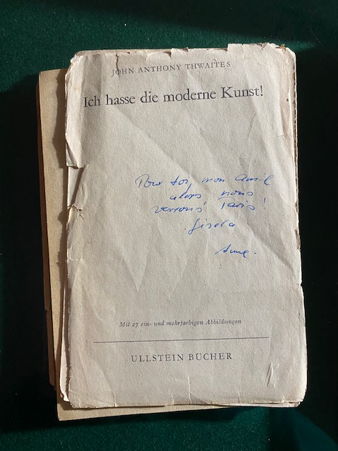 Heute erwischte ich das Büchlein „Ich hasse die moderne Kunst“ von John Anthony Thwaites, 1960 im Ullstein-Verlag verlegt und so arg zerlesen, dass es sich in der Mitte geteilt hat. Das Buch ist eine Einführung in die moderne Kunst für diejenigen, die sie „hassen“, oder besser: für die, sie sie weder kennen noch kennenlernen wollen. Das waren im damaligen Deutschland, wo Thwaites (britischer Kunstkritiker,1909-1981) als Mitarbeiter des britischen Konsulats seit 1946 lebte, so ziemlich alle. Denn „moderne Kunst“ hatte seit 1933 auf dem Kunstindex der Nazis gestanden.