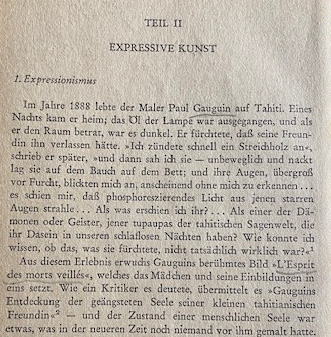 Dort, wo sich das Buch geteilt hat – S. 56 – beginnt „Teil II Expressive Kunst, I Expressionismus“, und zwar mit einer Erinnerung von Paul Gauguin.
