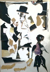 Die Schnipsel, die ich für das obige Legebild verwendete, stammen von Jürgen Küster aka Buchalov. Es sind ganz besondere Schnipsel, denn sie fielen an, als er Bilder aus Bögen schnitt, die ein verstorbener Freund und Atelierkollege, Peter Maschke, ihm hinterlassen hatte. Im Gegensatz zu den Schnipseln, mit denen ich gewöhnlich arbeite, handelt es sich bei Jürgens Material also um Verschnitt, um Übriggebliebenes, „Negatives“, wie es anfällt, wenn das „Eigentliche“, das Positive, das Werk, das Leben selbst herausgeschnitten wurde. Es ist das, was bleibt und entsorgt wird wie das Usambaraveilchen, von dem Mitzi Irsaj in ihrer schönen Erzählung „Frau Wolf zieht ein“ schreibt. Wie Mitzi das Veilchen, so ließ ich die Schnittreste eines Verstorbenen bei mir einziehen, auf dass sie weiterwirken und von einem vergangenen Leben in neuer Gestalt zeugen können. (Wie Jürgens Schnipsel zu mir kamen: hier).