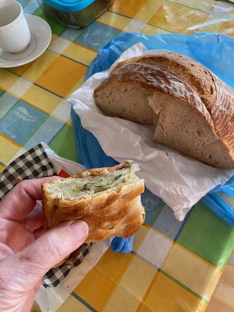 Um zu unserem Bäcker zu gelangen, der die duftenden mit Sauerteig angesetzten Brotlaiber backt, muss ich einen Pfad steil hinab steigen, ein Sträßchen und ein Flüsschen überqueren und an der anderen Seite wieder hinaufgehen. Unterwegs freute ich mich an einer neuem Pflasterung des Bürgersteigs. Bürgersteige sind hier eher rar, und wenn es sie gibt, werden sie meistens mit Straßenbäumen bepflanzt. Manche Anlieger pflegen das Stück Straße vor ihrer Haustüre und erweitern so ihren Wohnbereich. Diese hier haben einige reizende Marmor-Intarsien gelegt – Ornamente, Pflanzen und…