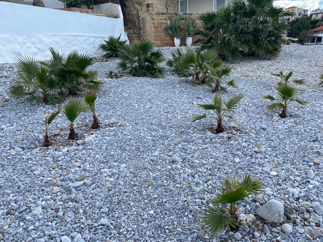 Unten in der Bucht, in einem Geröllfeld, haben Anrainer ein friedliches Palmenwäldchen gepflanzt. Jedes Mal, wenn ich vorbei komme, freue ich mich, dass die Pflänzchen sich gut entwickeln. Im Hintergrund sieht man eine schon recht große Palmen-Gruppe.