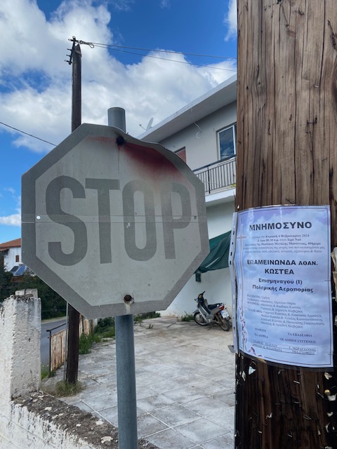 Dann verschwindet das Auto. Ich lese und erinnere mich an eine Nachricht, die vor anderthalb Monaten die Dorfgemeinschaft erschütterte: Ein Pilot und Ausbilder der Luftwaffe trat zu seinem letzten Flug an – und stürzte aus unbekannten Gründen ab. Die Medien waren voll davon. Er bekam ein Staatsbegräbnis, der Verteidigungsminister eilte nach Kalamata und hielt die Begräbnisrede. Nun, 40 Tage danach, wird eingeladen zum Mnemosyno, der üblichen Gedenkfeier. Ein rissiger durchlöcherter Strommast trägt die message, die bald einer ähnlichen weichen wird. (Epameinondas Kosteas, Foto: internet).