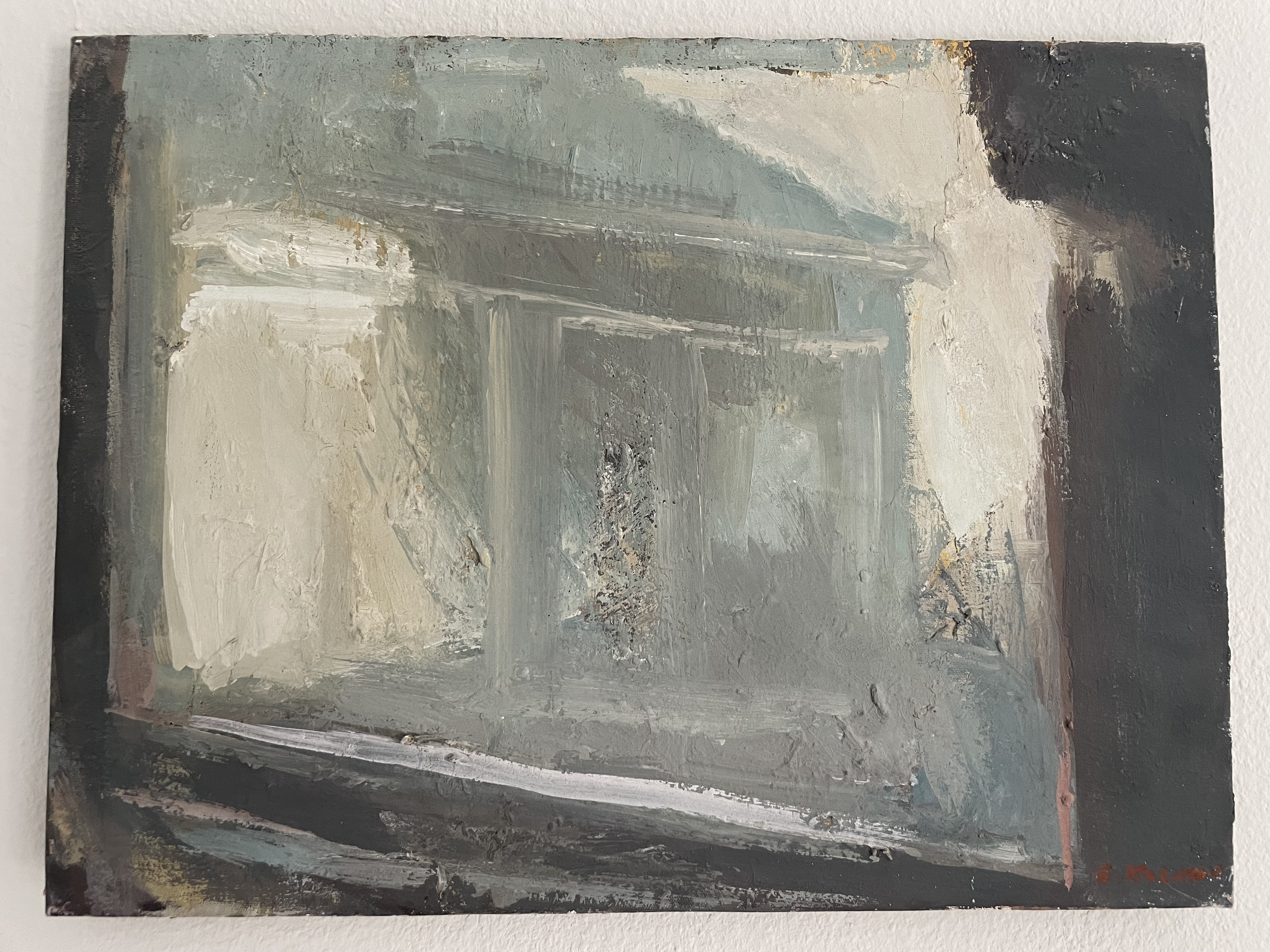 und ein grauer Tempel, der im Ausschnitt eines Gemäuers sichtbar wird. 60×45 cm.