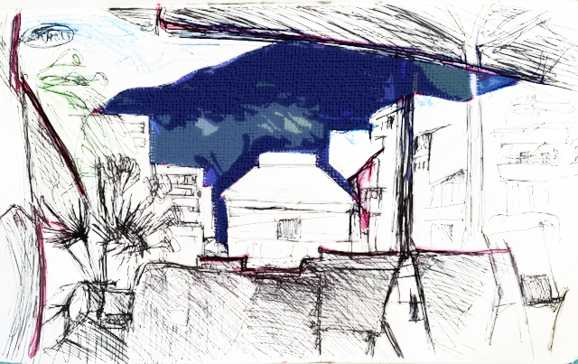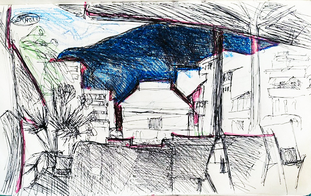 Gestern saß ich in einem Straßencafe, einen Espresso vor mir. Das Licht wechselte schnell und dramatisch. Der Zeitungskiosk gegenüber wurde grell von der Sonne angestrahlt, dahinter erhob sich in verfinstertem Blau die Bergwand. Ich versuchte, den Eindruck festzuhalten.