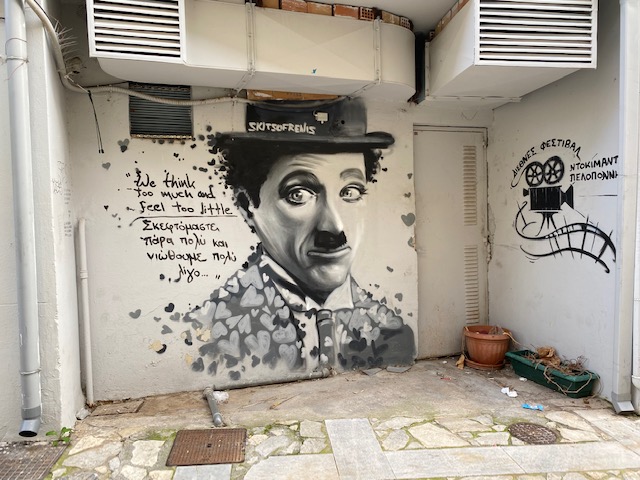 Immer mal wieder zeigte ich hier Grafittis – oder eigentlich schon richtiger: Wandmalereien – von einem hiesigen Künstler, der sich Skitsofrenis nennt. Heute entdeckte ich ein neues: Charly Chaplin und den Spruch „Wir denken zu viel und fühlen zu wenig“.