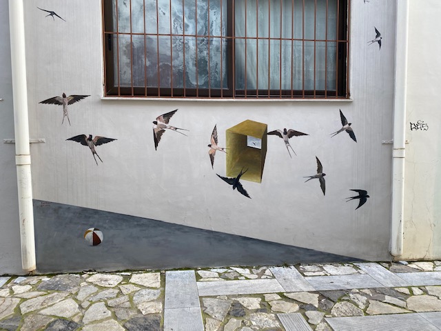 Und da aller guten Dinge drei sind: Auch die Nachbarwand war hübsch bemalt mit Schwalben, einem Briefkasten und einem Kinderball, das Ganze perspektivisch höchst eindrucksvoll arrangiert, so dass ich einem Moment lang stutzte, ob es sich wirklich um Aufgemaltes handelte.
