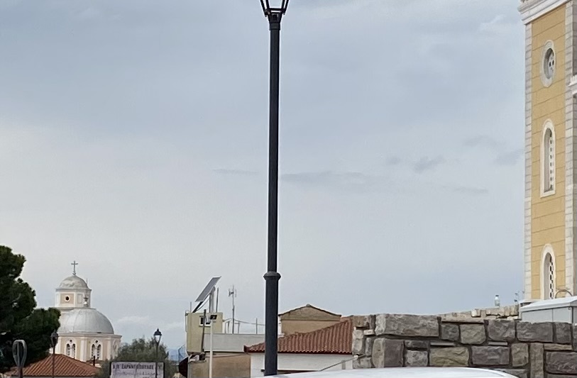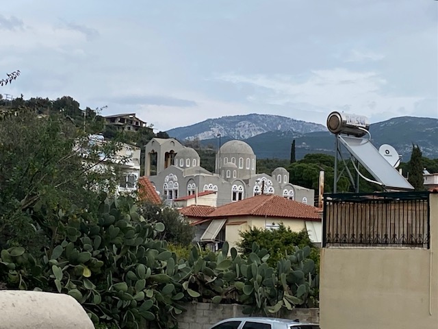 Die neue Klosterkirche der Heiligen Konstantinos und Eleni ist zwar nur eine dürftige Kopie der alten, macht sich aber recht hübsch durch den Bogen des Eingangs. Erfreulich sind auch die unbebauten Stücke Land, auf denen immergrüne Pflanzen und Bäume ihren südlichen Flair verbreiten.
