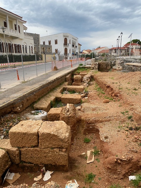 Auf dem Vorplatz der Hauptkirche haben die Archäologen nach den Fundamenten ich weiß nicht welcher Siedlung gebuddelt. Nach dem historischen Pharai vielleicht? Hinweisschilder fehlen, und der Bauschutt ist noch nicht weggeräumt.
