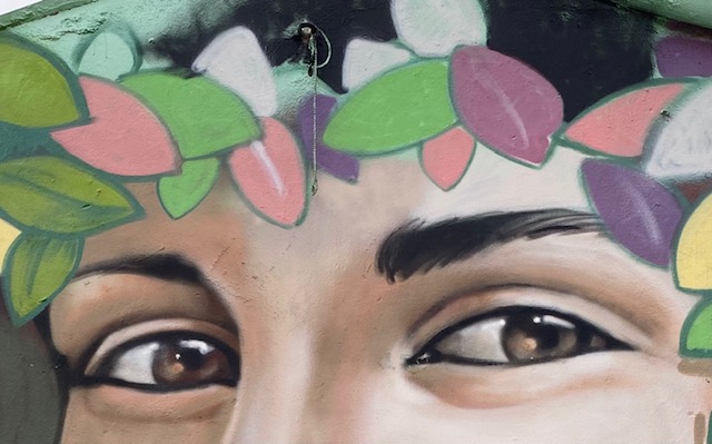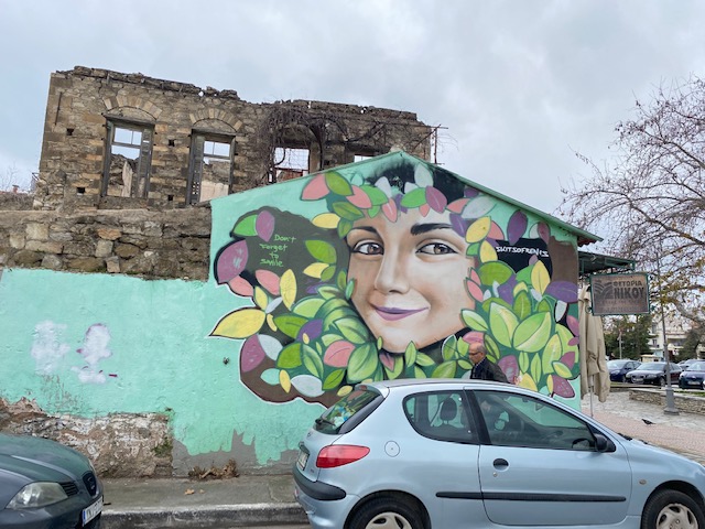 und schließlich vor der gepflegten Dauerruine am Wochenmarkt das lächende Blumenmädchen, das der euch längst bekannte Künstler Skitsofrenis an die Front eines Schuppens gesprüht hat.