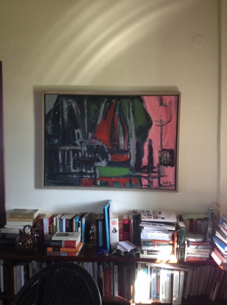 An eben dieser Stelle der Wand hing zuvor ein anderes Bild. Eines Tages bemerkte ich, wie es im Licht der tief stehenden Sonne aufleuchtete. Und machte ein Foto. In dem breiten orangefarbenen Streifen bilden sich der Schatten des Fenstergitters ab. Es fügt sich in das Bild ein, als sei es ein Teil der Zeichnung.