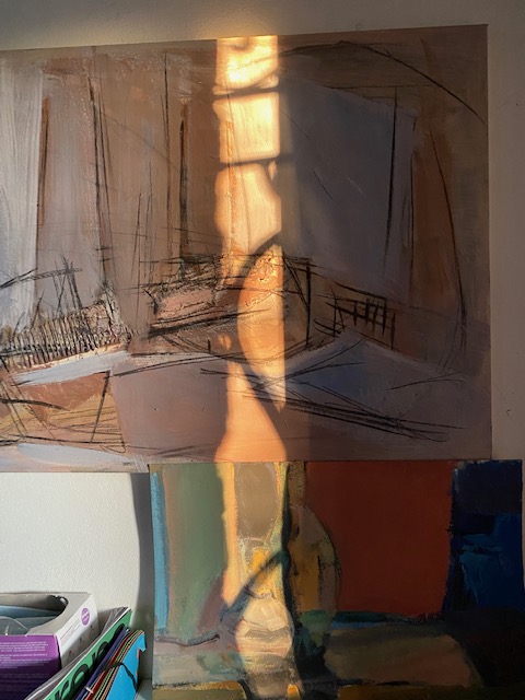 Als ich Petras Reihe sah, fielen mir eigene Fotos ein, die ich von Gemälden in unserem Wohnraum machte, als sie von der tief stehenden Sonne getroffen wurden. Das obere hatte ich grad aufgehängt, das untere stand als Alternative bereit. Ein Lichtstreifen verband die beiden auf magische Weise, machte sie zu einem Bild.