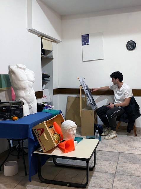 ← Raumperspektive mit Skulturen und Zeichner (tägliches Zeichnen)