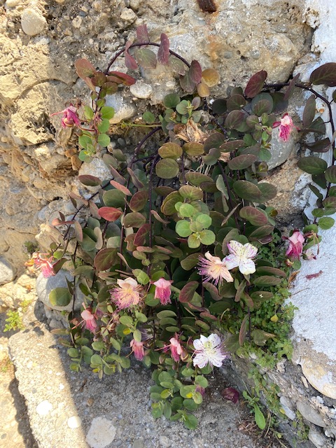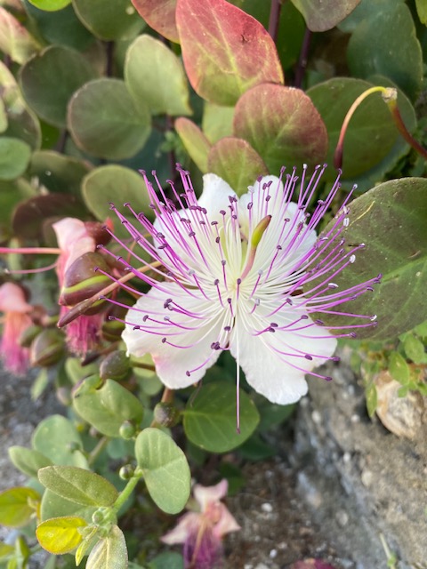 Einen kleinen Spaziergang machte ich heute Mittag am Strand. Zu meiner Freude entdeckte ich eine blühende Kapernpflanze. Ein wenig zerzaust war sie.