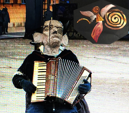 Den Akkordeonspieler mit neuem Kopf, einem gongschlagenden Engel im Hintergrund und in emotionalen Farben finde ich sehr ausdrucksstark zumal der Kopf perfekt mit der Körperhaltung übereinstimmt. Und so eine tolle Idee! Wie wohl sein Leben verläuft oder verlaufen ist ? Wäre auch eine interessante Geschichte