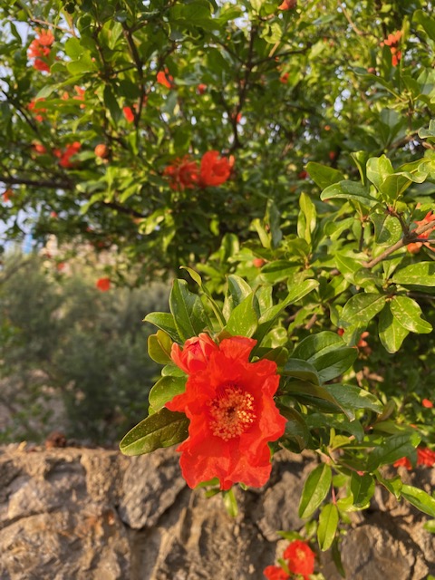 Jetzt ist die Zeit der Granatapfelblüte, und ein zärtliches Granatapfellicht füllt die Atmosphäre, ganz anders als das im Herbst, als die Granatäpfel reiften (hier).